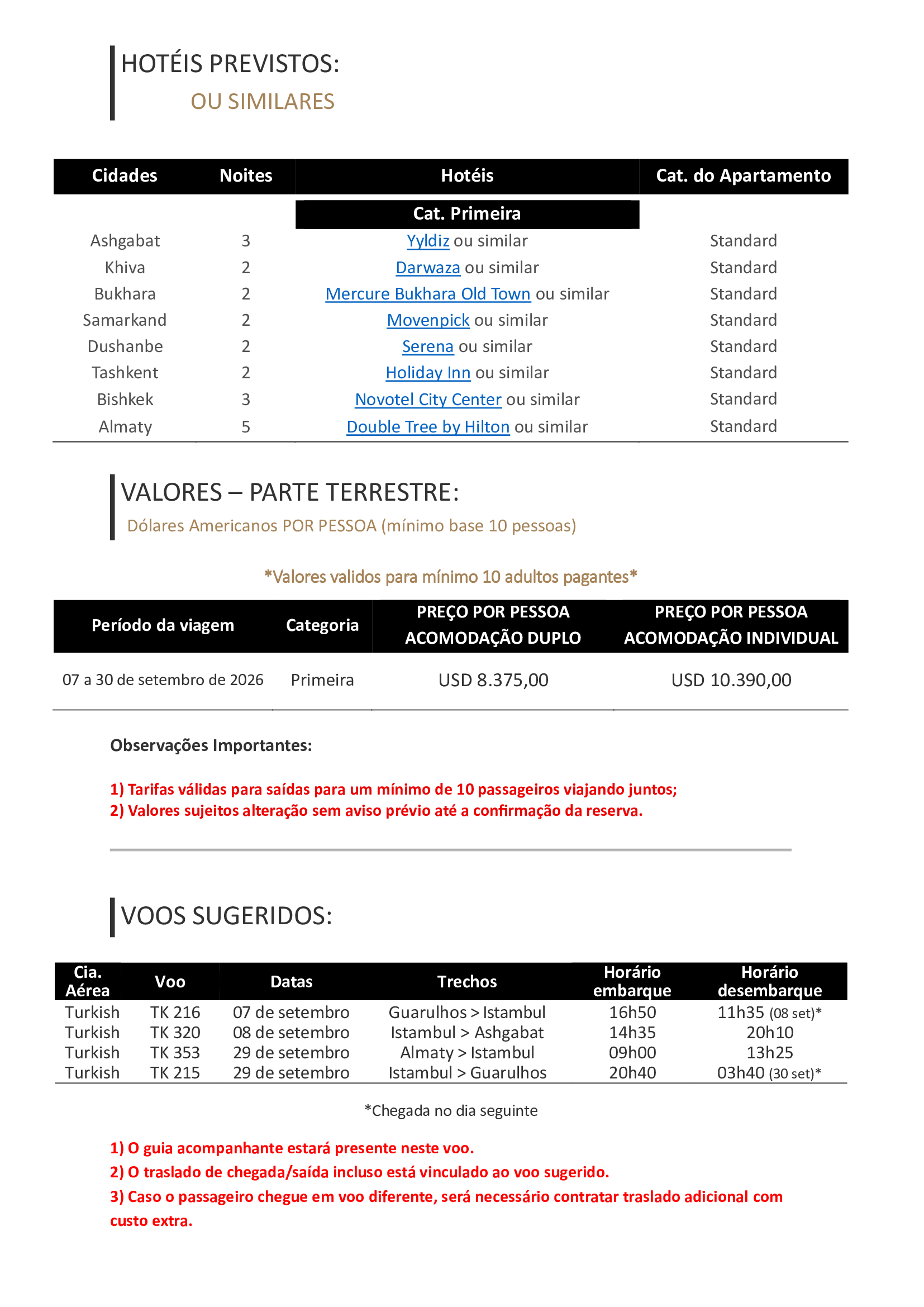 - Bilhete aéreo para os trechos internos: Ashgabat / Dashoguz + Dushanbe / Tashkent + Tashkent / Bishkek + Bishkek / Almaty (classe econômica, emitidos e entregues pelo operador local);