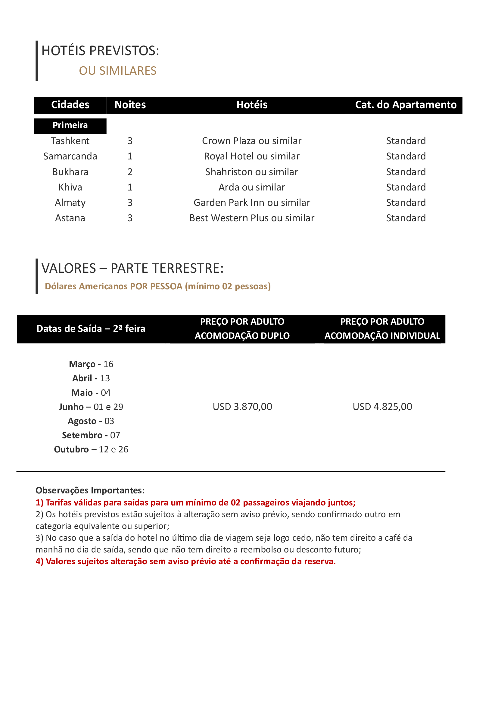 - Bilhetes de trem nos trechos: Tashkent / Samarcanda com assentos reservados em classe turística, a ser entregue pelo operador local;