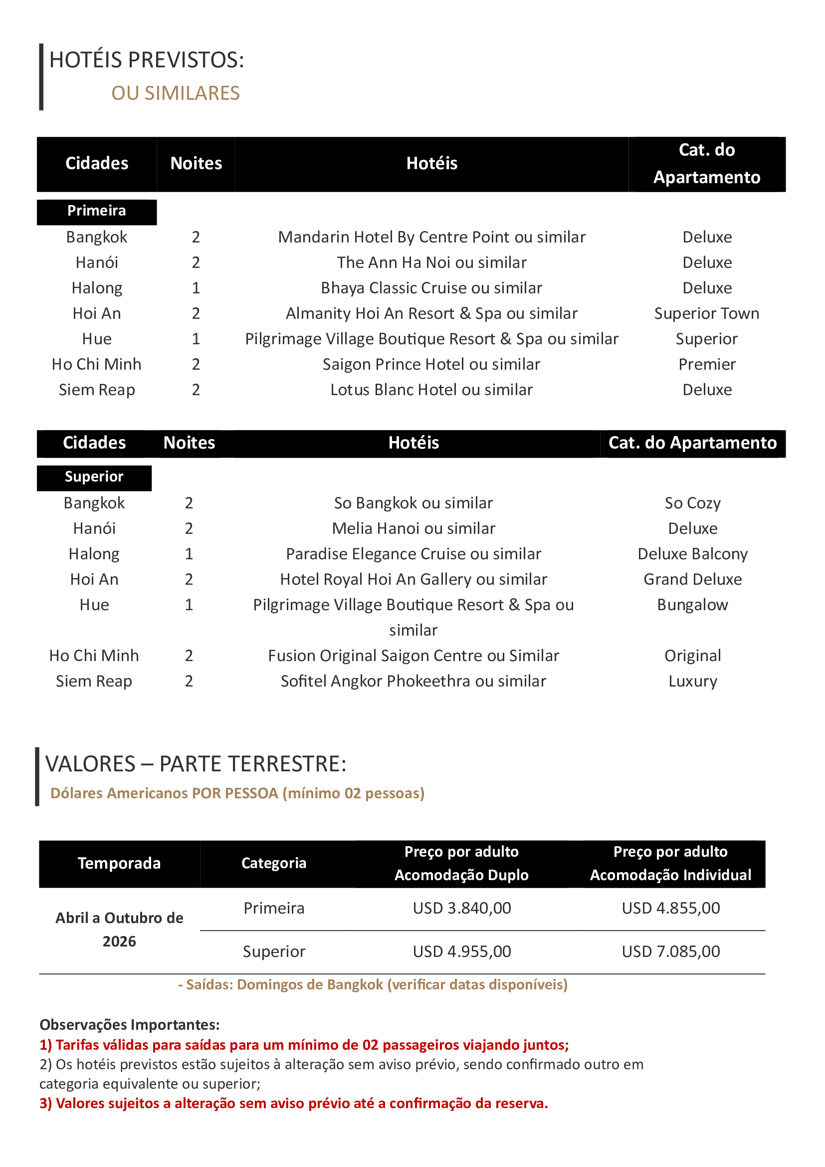 - Bilhete aéreo no trecho: Bangkok/ Hanoi, Hanoi /Danang, Hue/Ho Chi Minh, Ho Chi Minh/ Siem Reap & Siem Reap/Bangkok com assentos reservados em classe turística, a ser entregue pelo operador local;