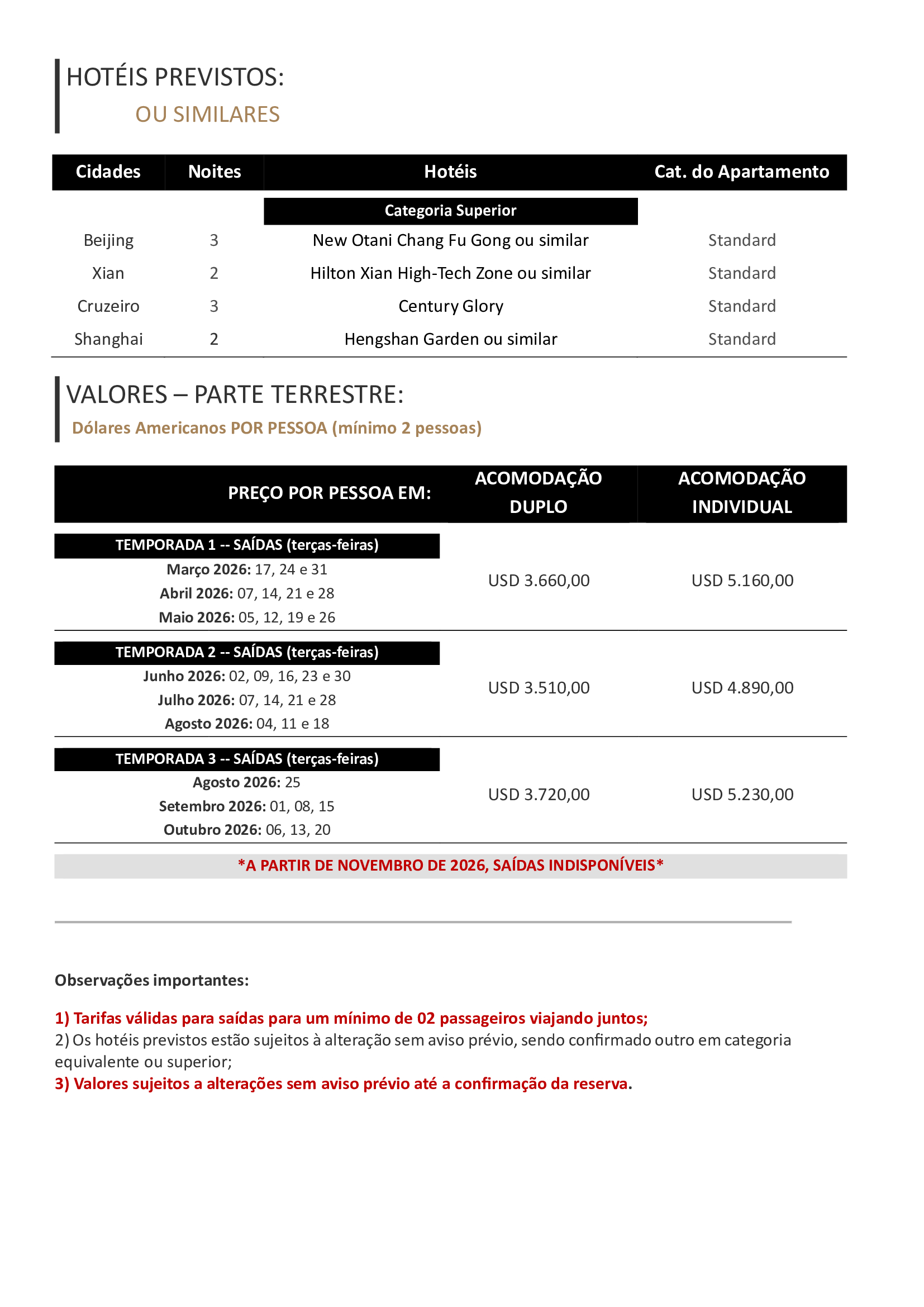 - Ticket de trem para os trechos: Beijing / Xian + Xian / Chongqing + Yichang / Shanghai – (classe econômica, emitidos e entregues pelo operador local);