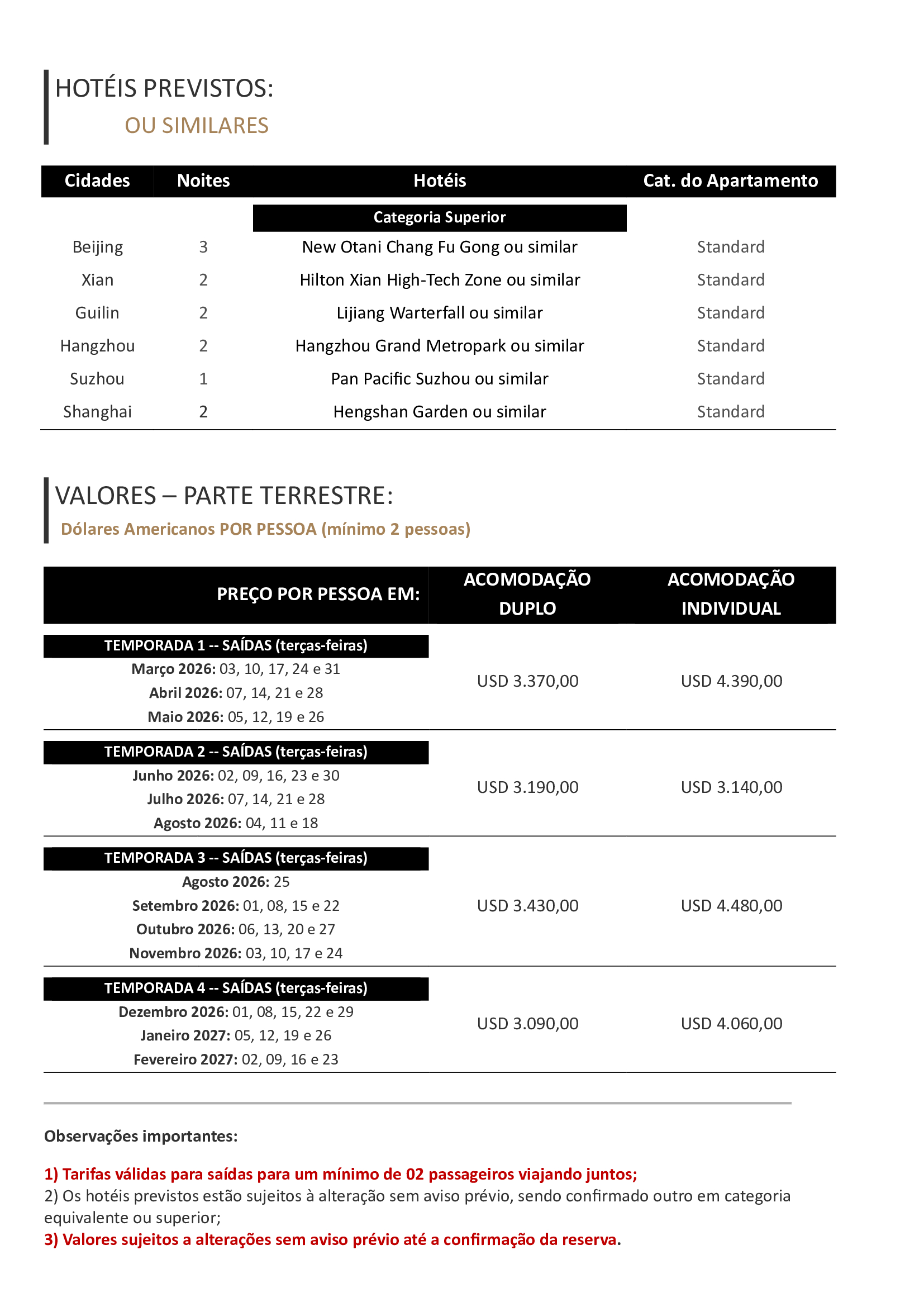 - Ticket aéreo para os trechos: Xian / Guilin + Guilin / Hangzhou – (classe econômica, emitidos e entregues pelo operador local);
