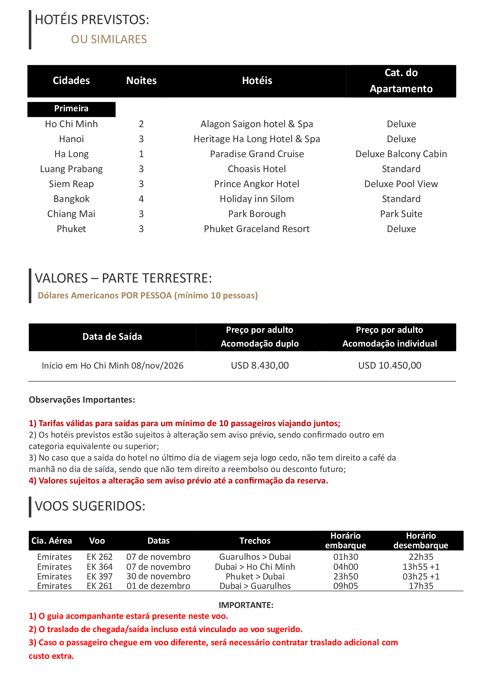 - Acompanhamento de Guia Brasileiro nos 26 dias da viagem (Iniciando em Ho Chi Minh em 08 de novembro e finalizando em Phuket em 01 de dezembro de 2026), mínimo de 10 passageiros.