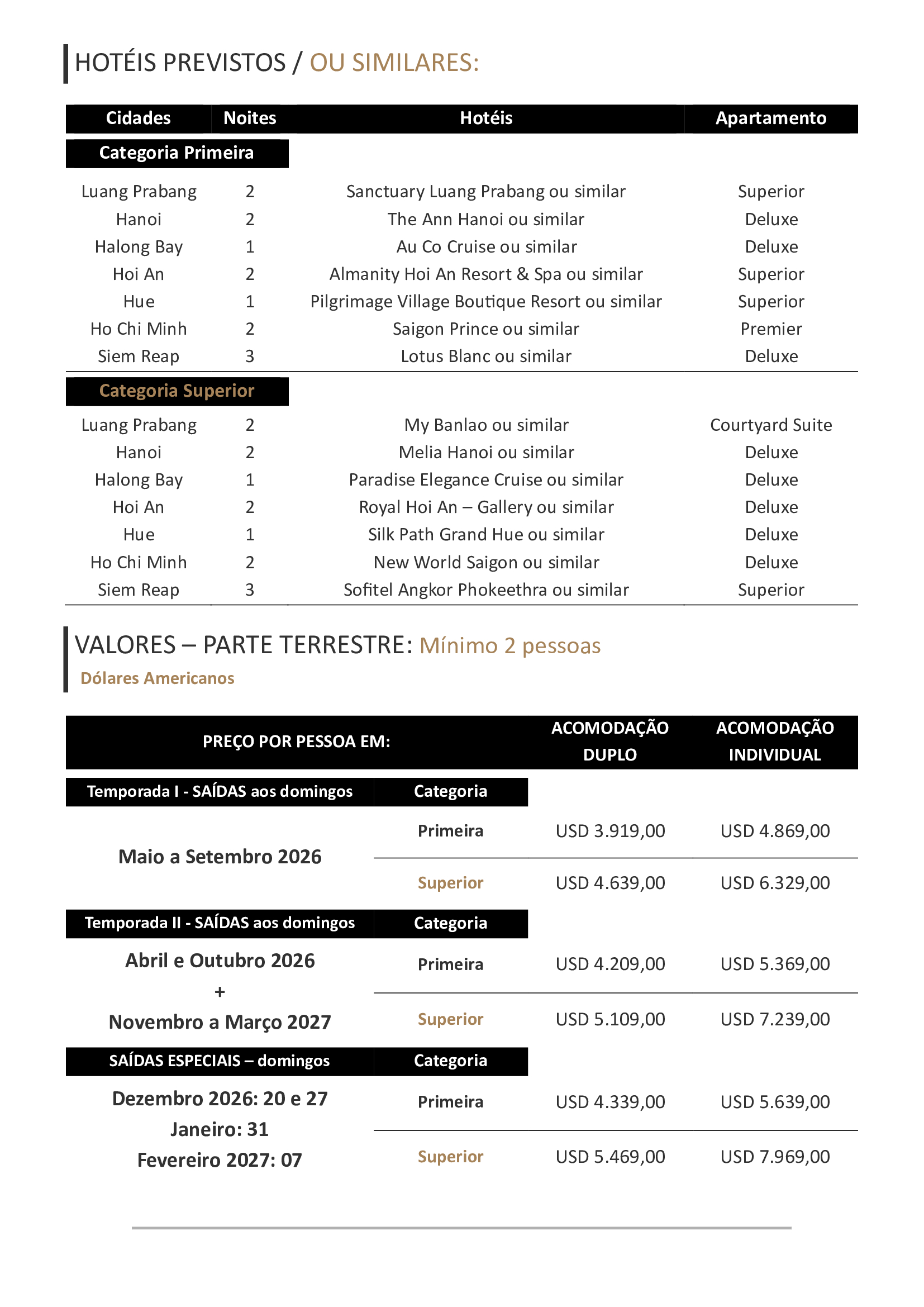 - Bilhetes aéreos para os trechos internos: Luang Prabang / Hanói + Hanói / Da Nang + Hue / Ho Chi Minh +
