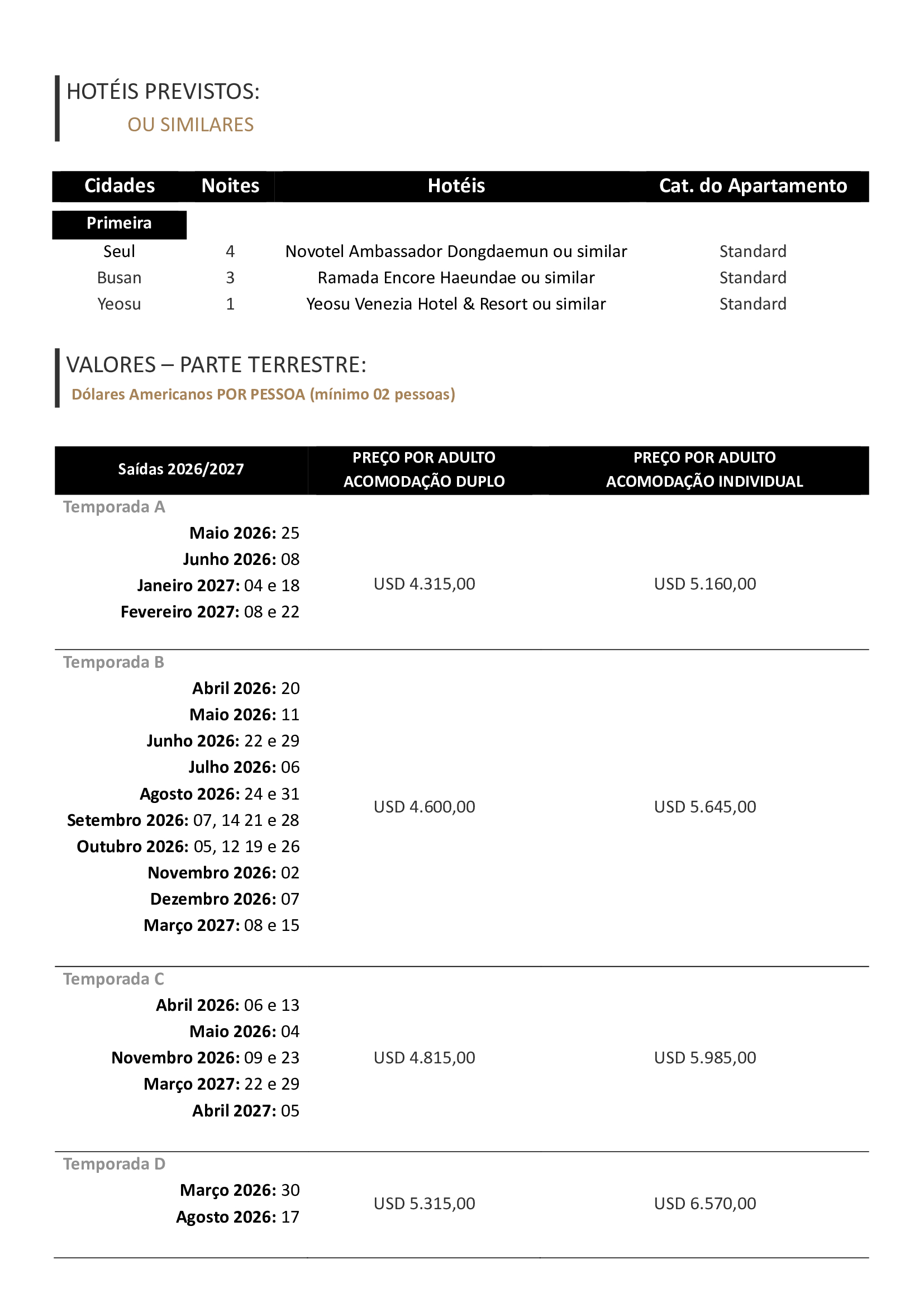 - Eticket aéreo para os trechos: Seul / Busan + Yeosu / Seul – (classe econômica, emitidos e entregues pelo operador local);