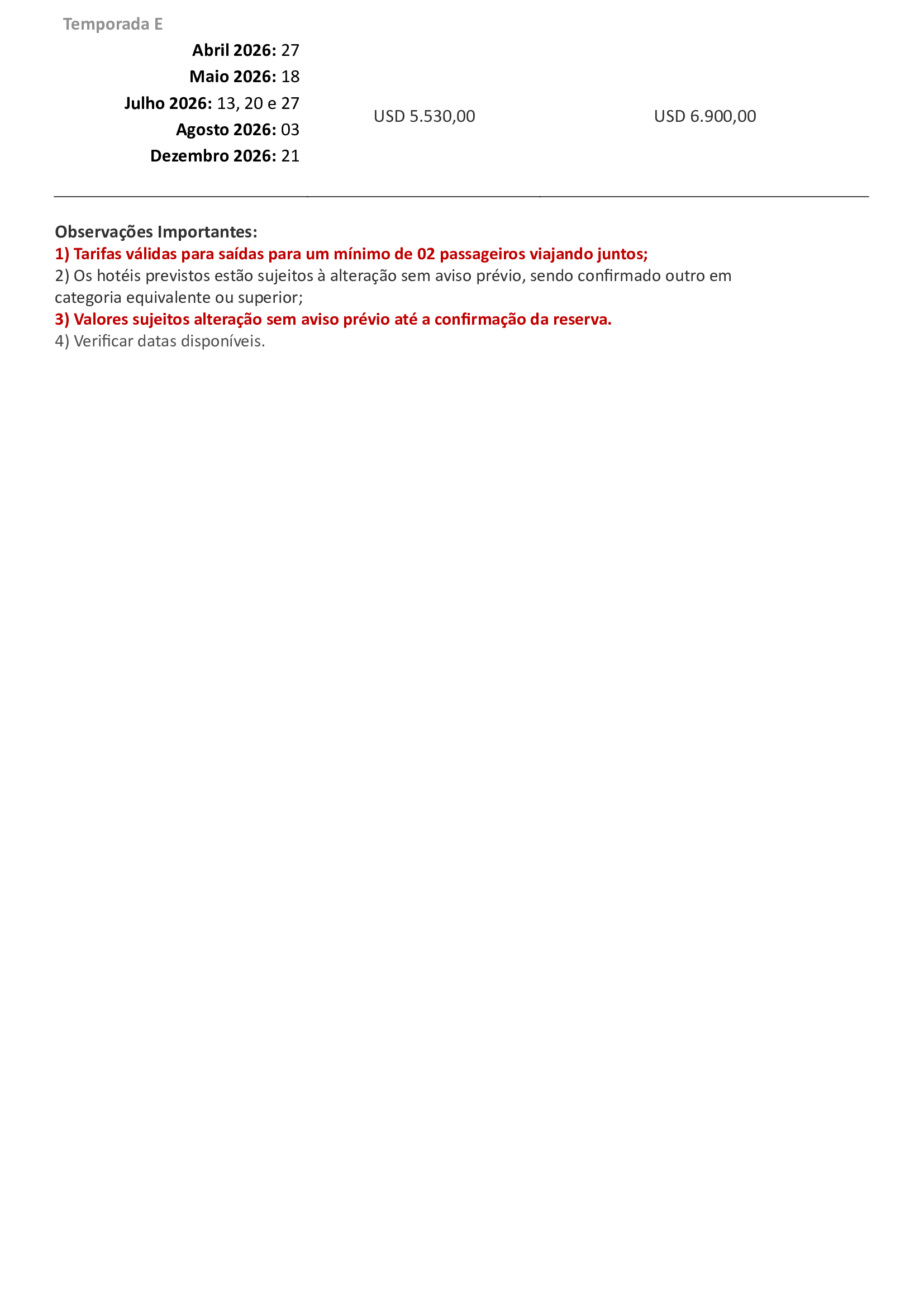 4) Importante ressaltar que dentro da validade de cada tarifa informada, a data do check-out deve coincidir com a última data de validade do período;