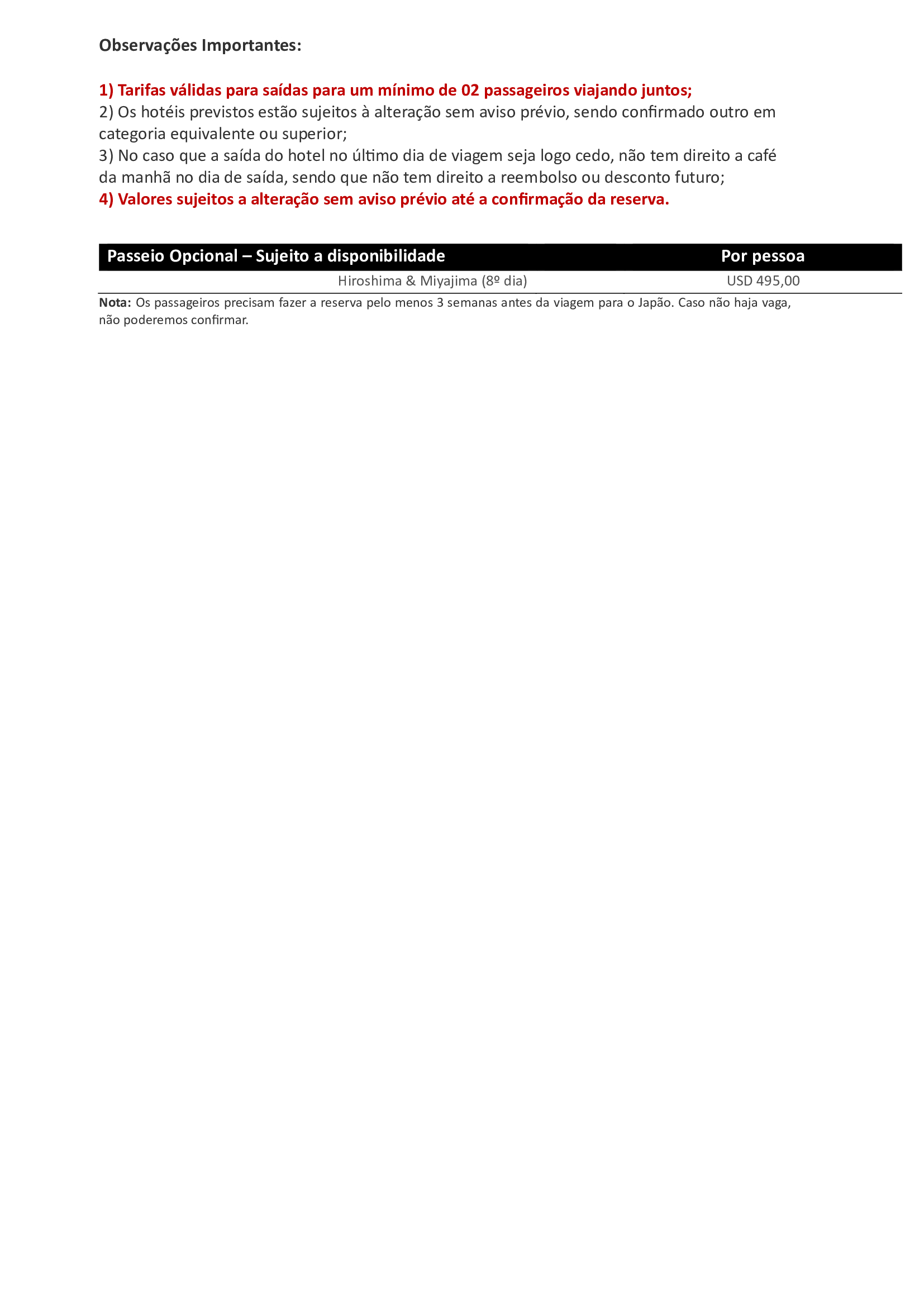 - Transporte de 01 (uma) mala por pessoa no dia 06 do itinerário Tokyo/Kyoto e no dia 09 Kyoto/Osaka serão transportadas separadamente em caminhão direto até o hotel;