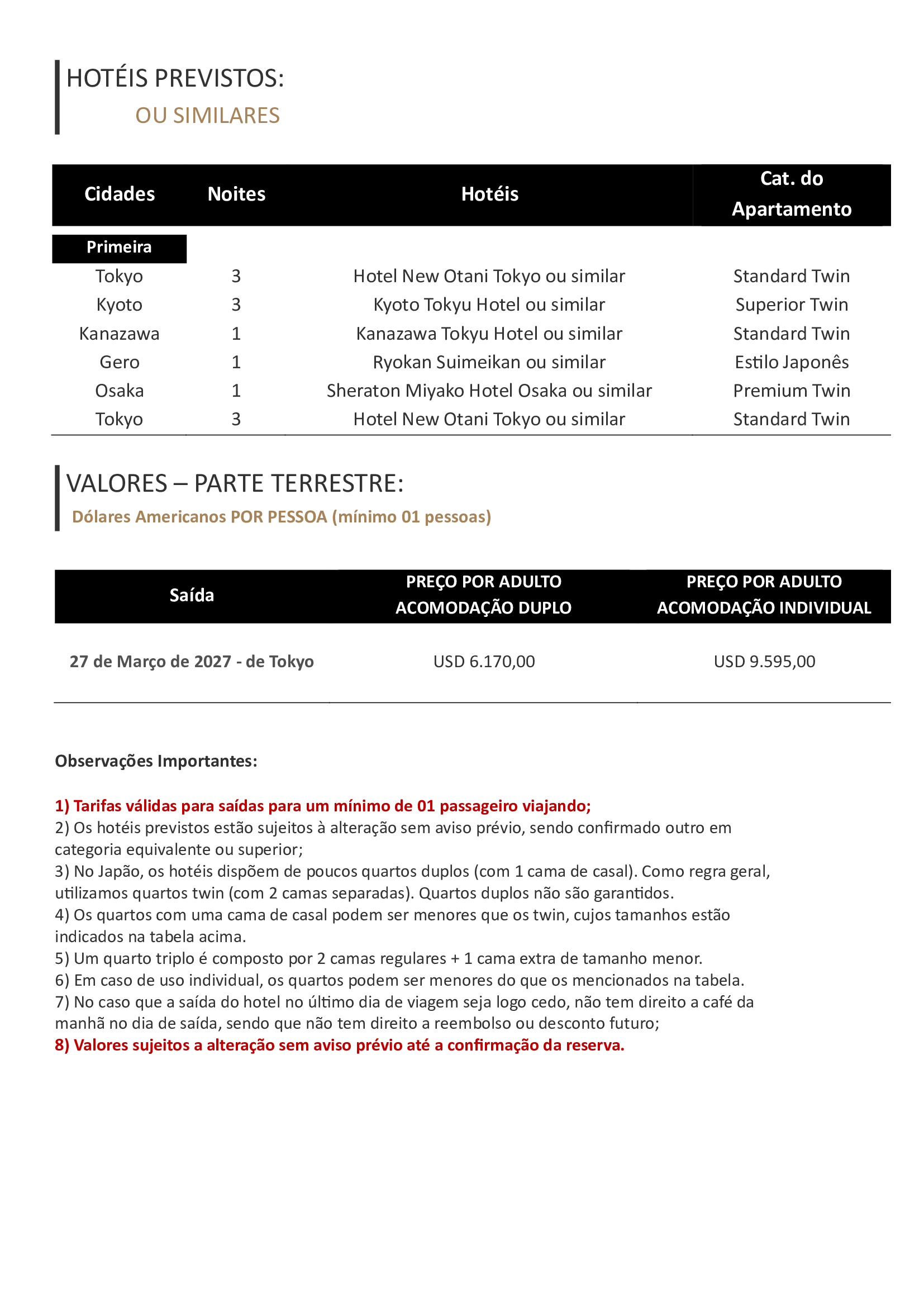 - Transporte de 01 (uma) mala por pessoa no dia 06 do itinerário Tokyo/Kyoto e no dia 09 Kyoto/Tokyo serão transportadas separadamente em caminhão direto até o hotel;