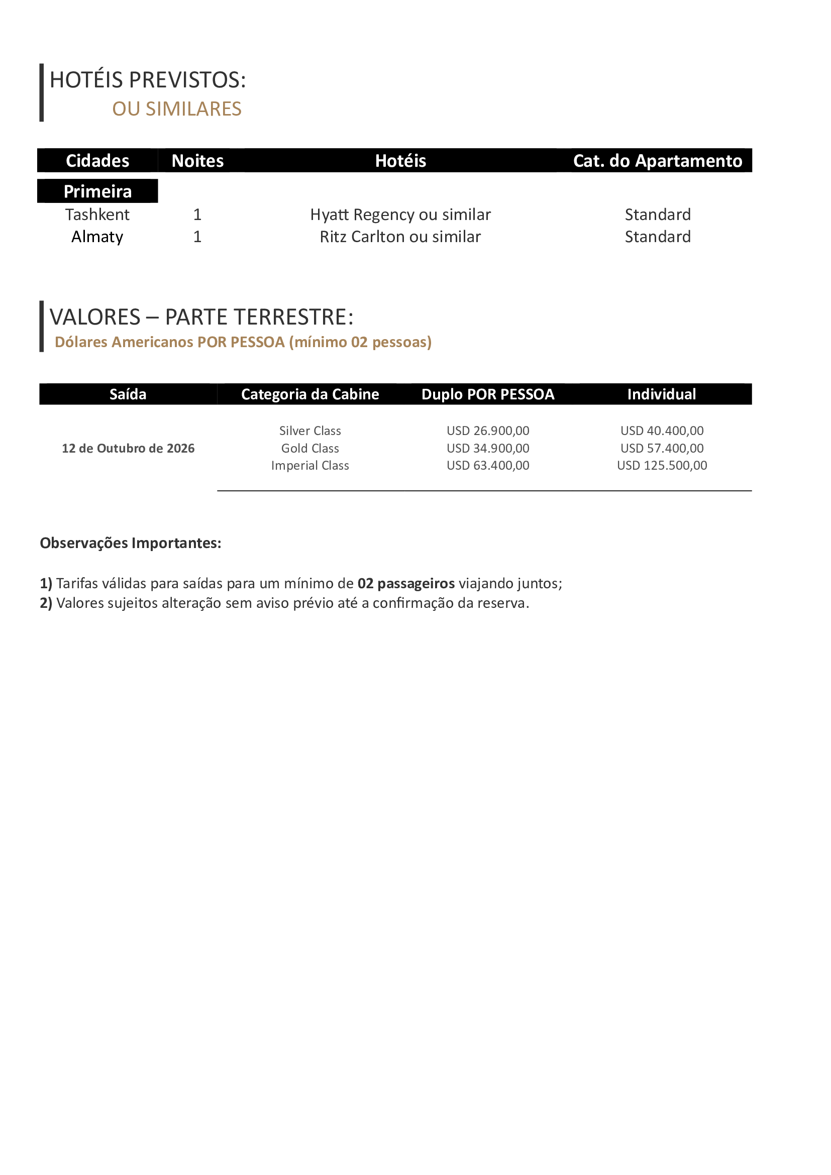 - 01 (uma) noite de hospedagem com café da manhã em Tashkent;