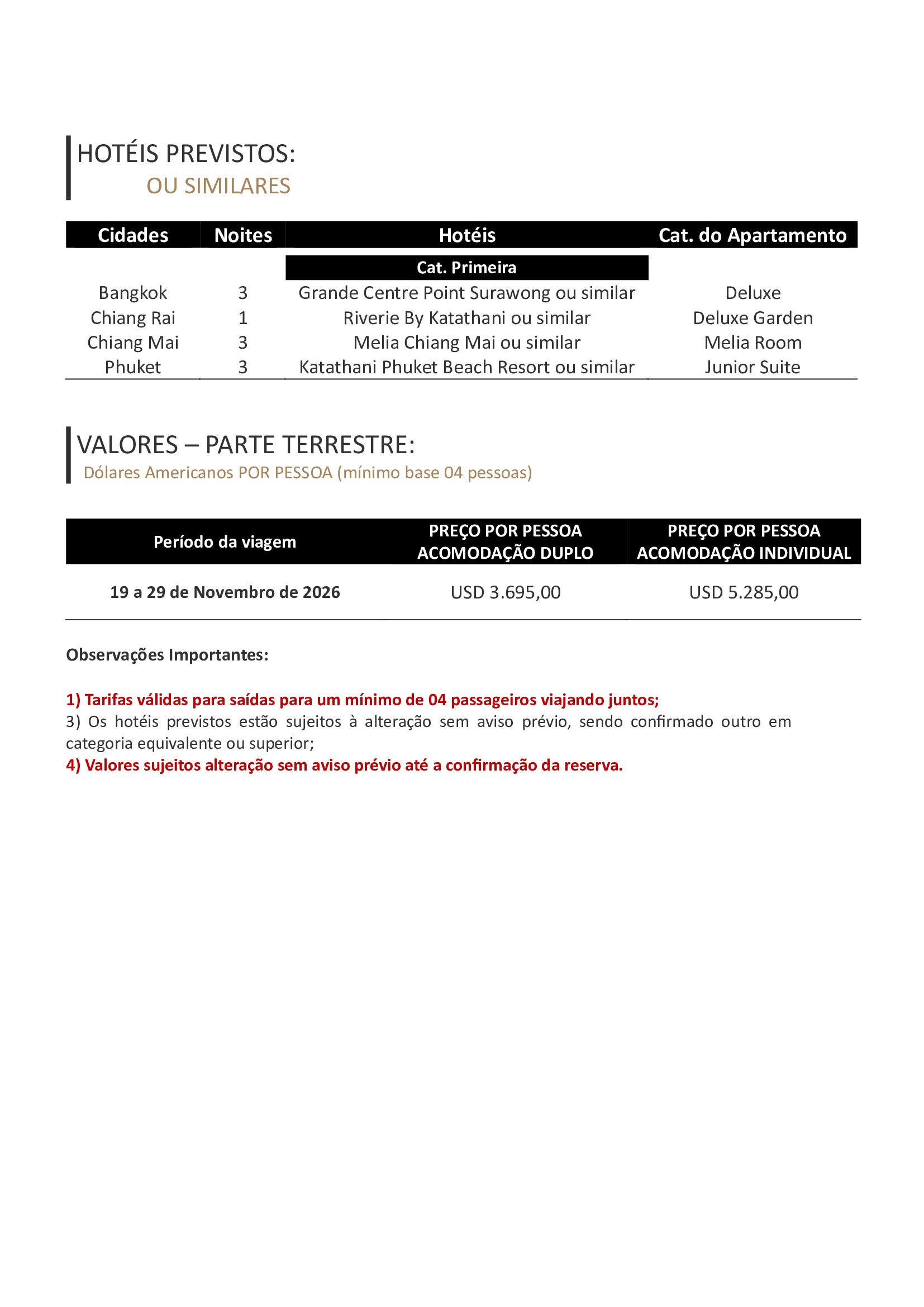 - Passeios e visitas conforme o itinerário, com ingressos incluídos, realizados em serviço regular (compartilhado) e acompanhados por guia local em português em Bangkok e em espanhol em Chiang Rai, Chiang Mai e Phuket. No passeio a Koh Phi Phi, o guia será em inglês;