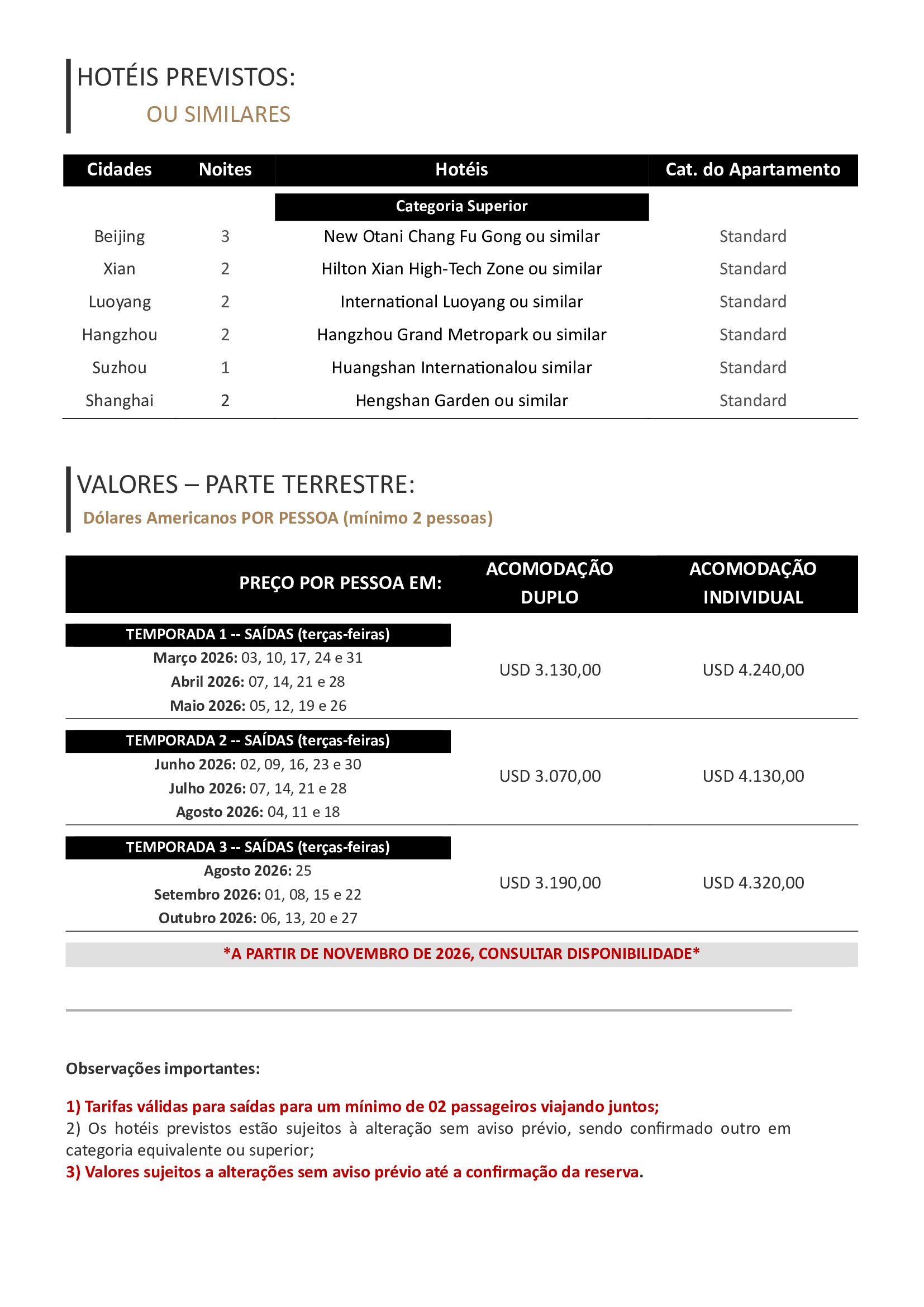 - Ticket de trem para os trechos: Beijing / Xian + Xian / Luoyang + Hangzhou / Suzhou + Suzhou / Xangai – (classe econômica, emitidos e entregues pelo operador local);