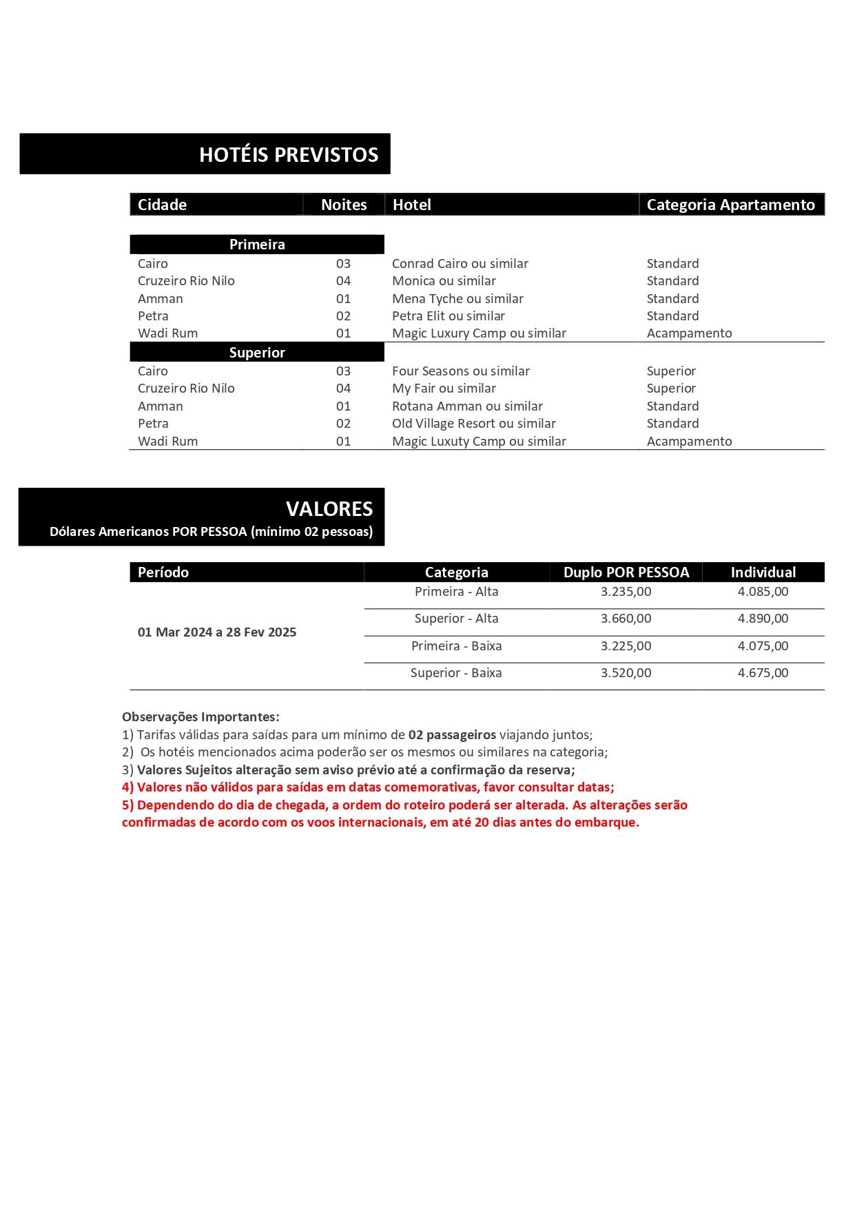4) Importante ressaltar que dentro da validade de cada tarifa informada, a data do check-out deve coincidir com a última data de validade do período;