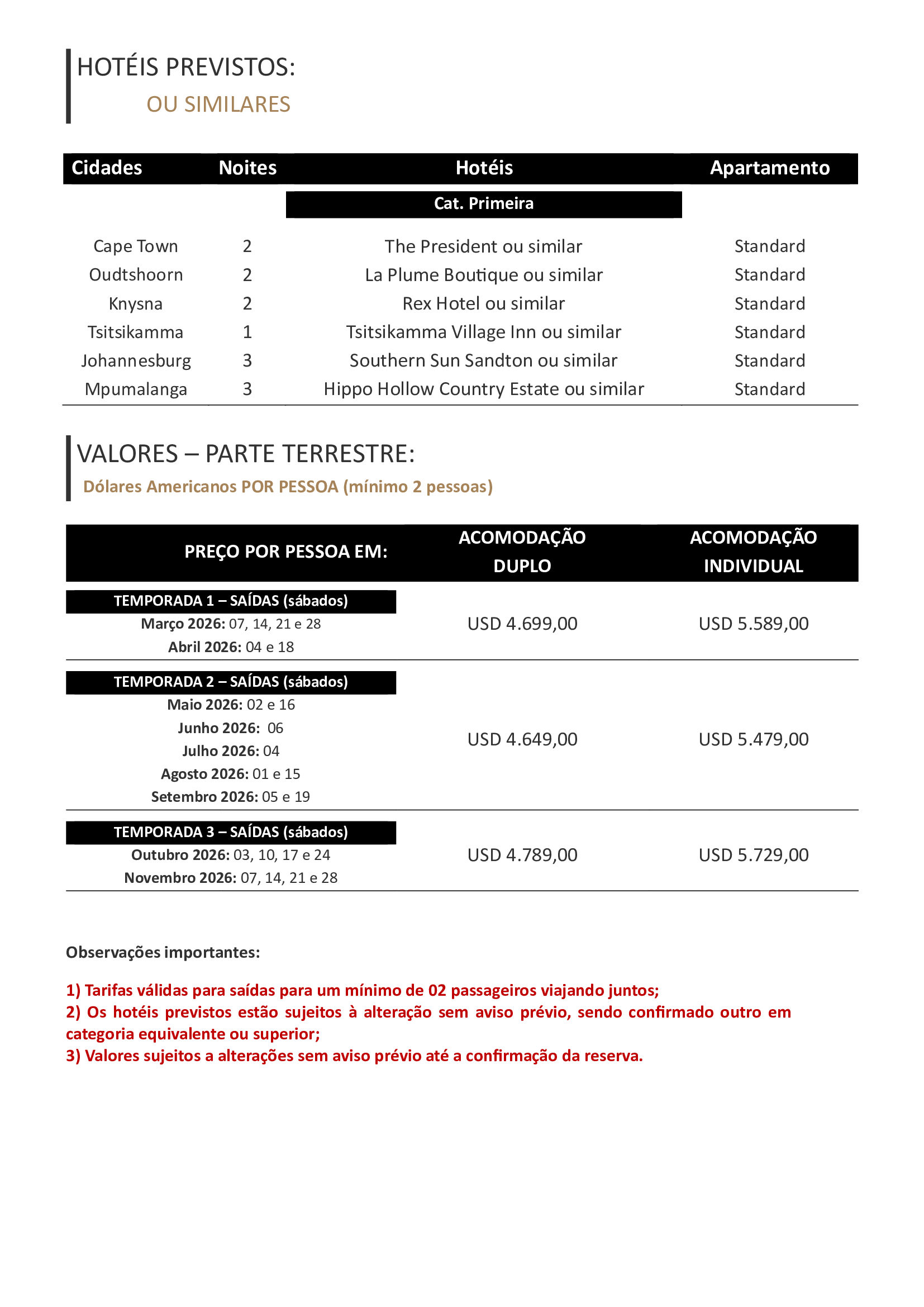 4) Importante ressaltar que dentro da validade de cada tarifa informada, a data do check-out deve coincidir com a última data de validade do período;